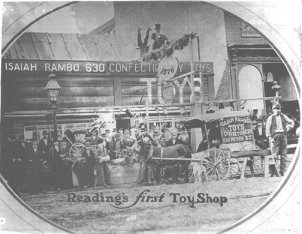 One of the prominent business houses of Reading of 46 years ago was the toy and novelty store of Isaiah Rambo, 630 Penn St. The store was a low, one-story frame structure, with a frontage of 35 feet, and occupying the site on which the store stood extended to Cherry Street, a depth of 230 feet, with a large stable on the rear. The property at that time was owned by Mrs. Susan Boyer. A rental of $35 a month was paid by Mr. Rambo, which amount included the stable, in which he kept a small donkey that had been one of the attractions of the Barnum circus, and which was utilized by him for advertising purposes.