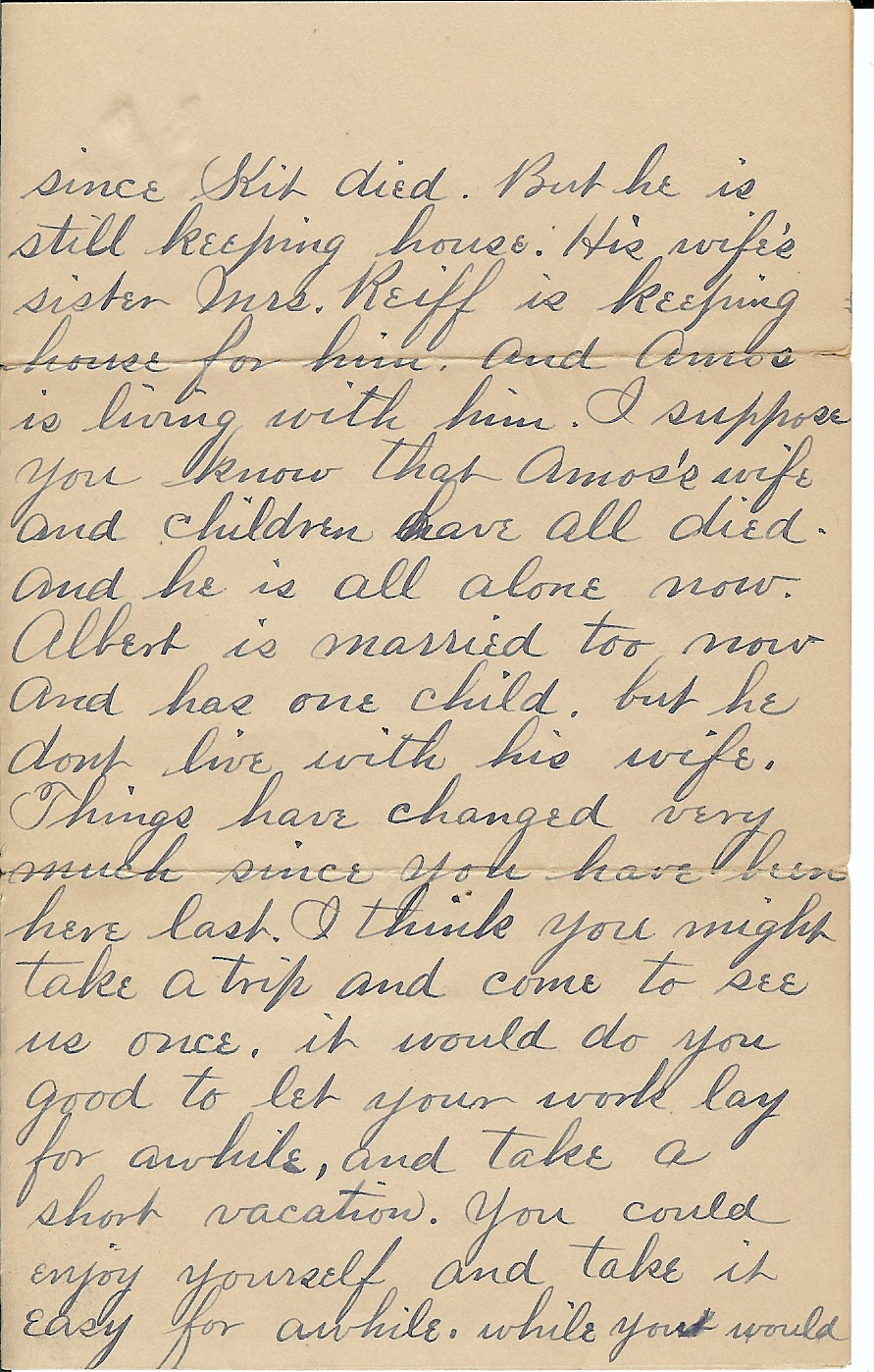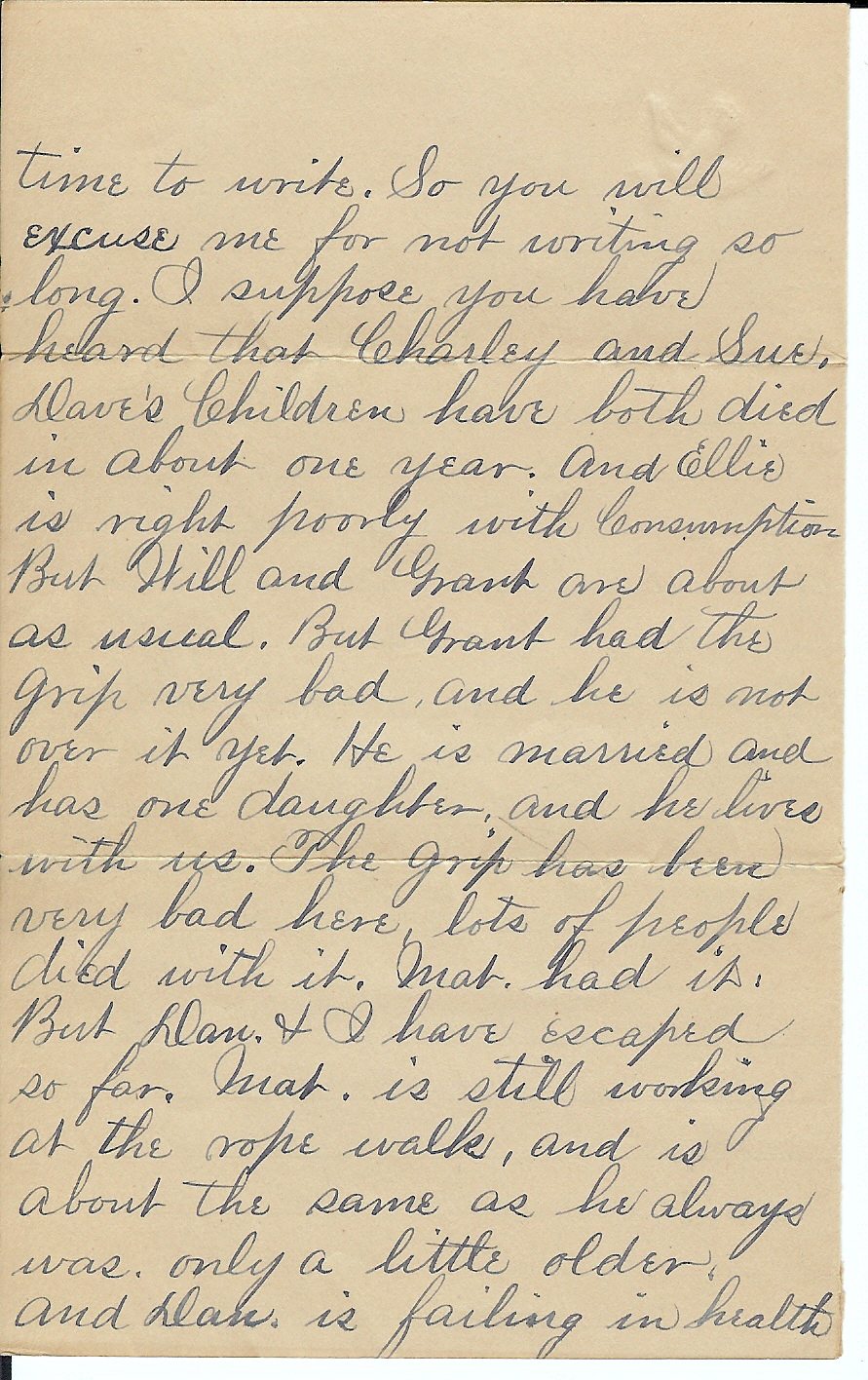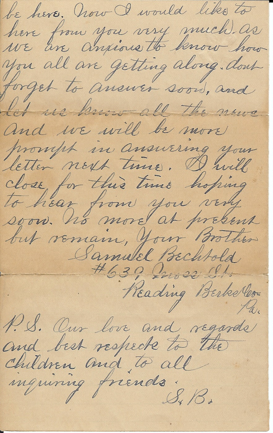 We received a letter from Amos last week and he said that he received a letter from Ada, stating that you were failing in health. We are all well and hearty and hope you are all improved to the same state. We are living in Reading now and I am working as night watchman, at the rope walk. I have worked continually every night for nearly four years, and as I have to sleep in day time, you can see that I haven't got much time to write. So you will excuse me for not writing so long. I suppose you have heard that Charley and Sue, Dave's children have both died in about one year, and Ellie is right poorly with consumption. But Will and Grant are about as usual. But Grant had the grip very bad, and he is not over it yet. He is married and has one daughter and he lives with us. The grip has been very bad here, lots of people died with it. Mat. had it. But Dan & I have escaped so far. Mat. is still working at the rope walk, and is about the same as he always was only a little older. And Dan. is failing in health since Kit died. But he is still keeping house. His wife's sister Mrs. Reiff is keeping house for him. And Amos is living with him. I suppose you know that Amos's wife and children have all died. And he is all alone now. Albert is married too now and has one child, but he don't live with his wife. Things have changed very much since you have been here last. I think you might take a trip and come to see us once, it would do you good to let your work lay for awhile, and take a short vacation. You could enjoy yourself and take it easy for awhile, while you would be here. Now I would like to here from you very much, as we are anxious to know how you all are getting along. don't forget to answer soon, and let us know all the news and we will be more prompt in answering your letter next time. I will close for this tie hoping to hear from you very soon. No more at present but remain, your Brother