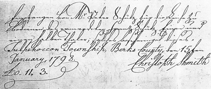 Received of Mr. Peter Schütz for the funeral[?] to serve the named Franz Schütz one and a half Taler; this confirms receipt. Tulpehoccan Township, Berks County, the 15th of January, 1798.
