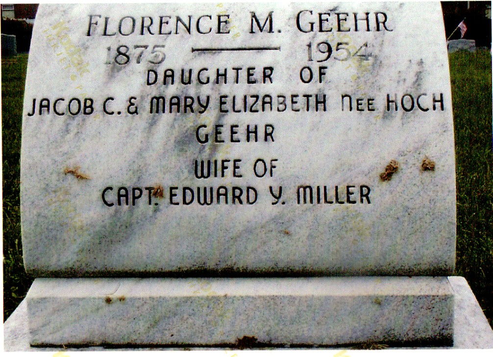 | Miller, Florence M. Geehr | 1875 | 1954 | Daughter of Jacob C. & Mary Elizabeth (nee Hoch) Geehr; wife of Capt. Edward Y. Miller | Picture | Margaret |