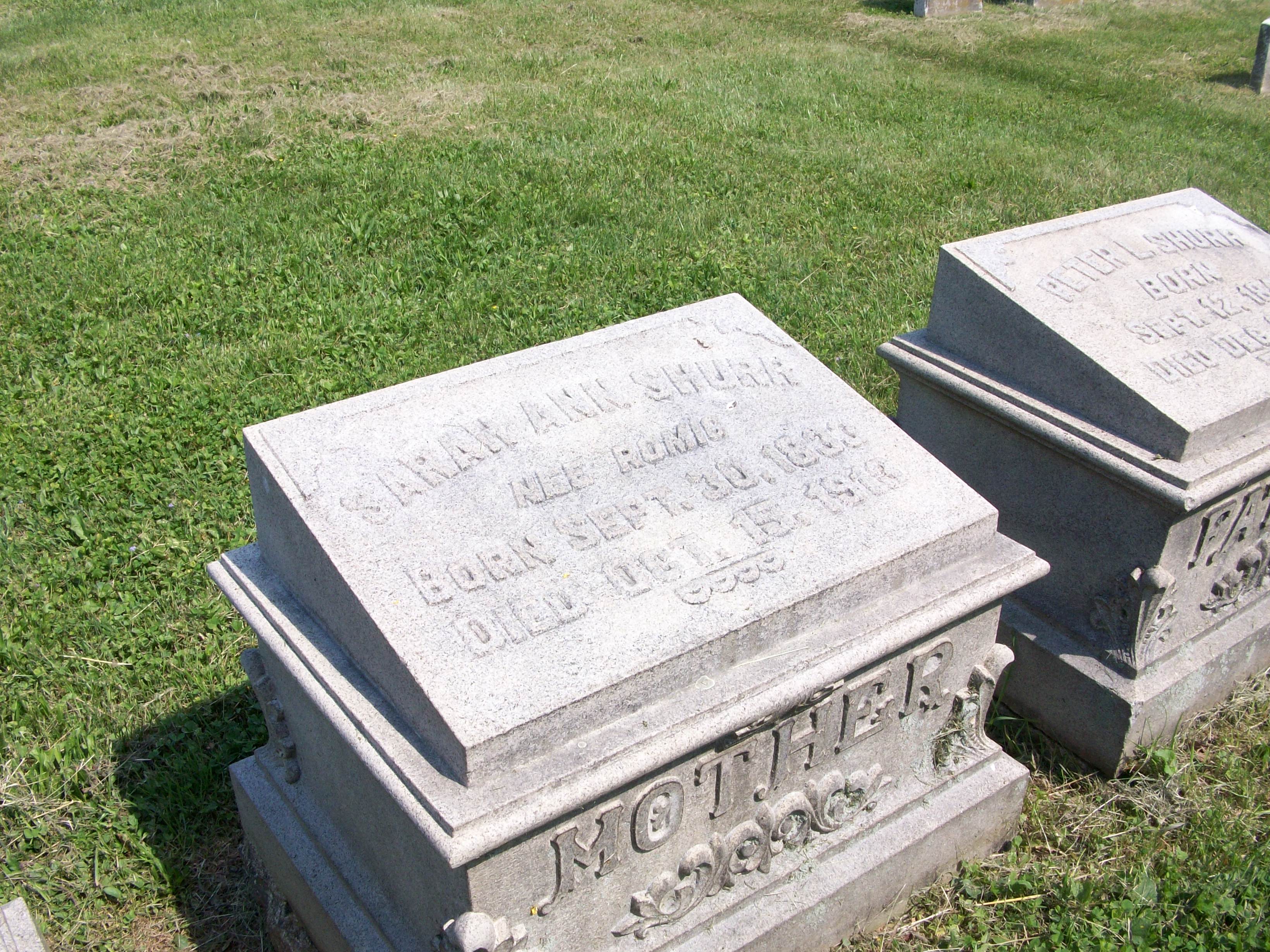 | Shurr, Peter L. | Sept 12, 1846 | Dec 9, 1907 | Second husband of Sarah Ann Romig; photo 1, photo 2 (right) | Bonnie |
