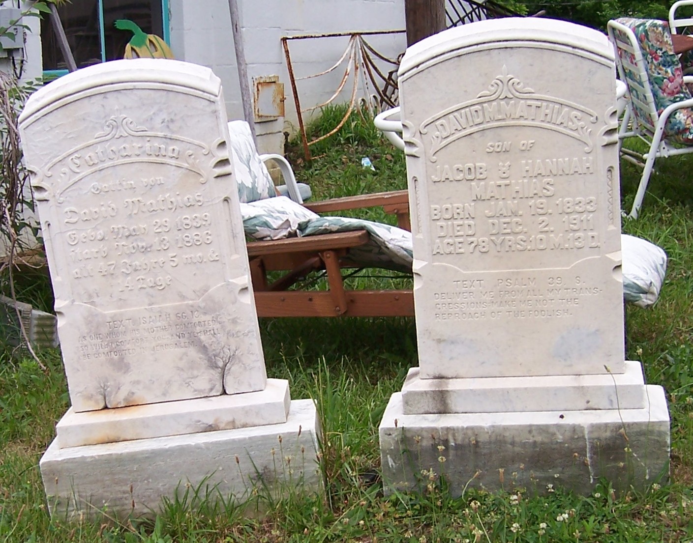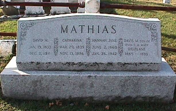 ** The tombstones of David M. and Catharina Mathias were found at an antique store in Downingtown, PA c. June 2006 by David, one of the submitters. Around 1942, the original tombstones of David M. Mathias, Catharina Mathias, Hannah Mathias (their daughter) and Davis Diliplane (their grandson) were removed and replaced by a newer tombstone. Two tombstones were sold to Utterly Beloved Productions for use in the movie, "Beloved," which was filmed in Philadelphia some years ago. It is unclear which tombstones were actually sold to Utterly Beloved Productions. The original tombstone of Davis M. Diliplane is on a farm in Earl township.