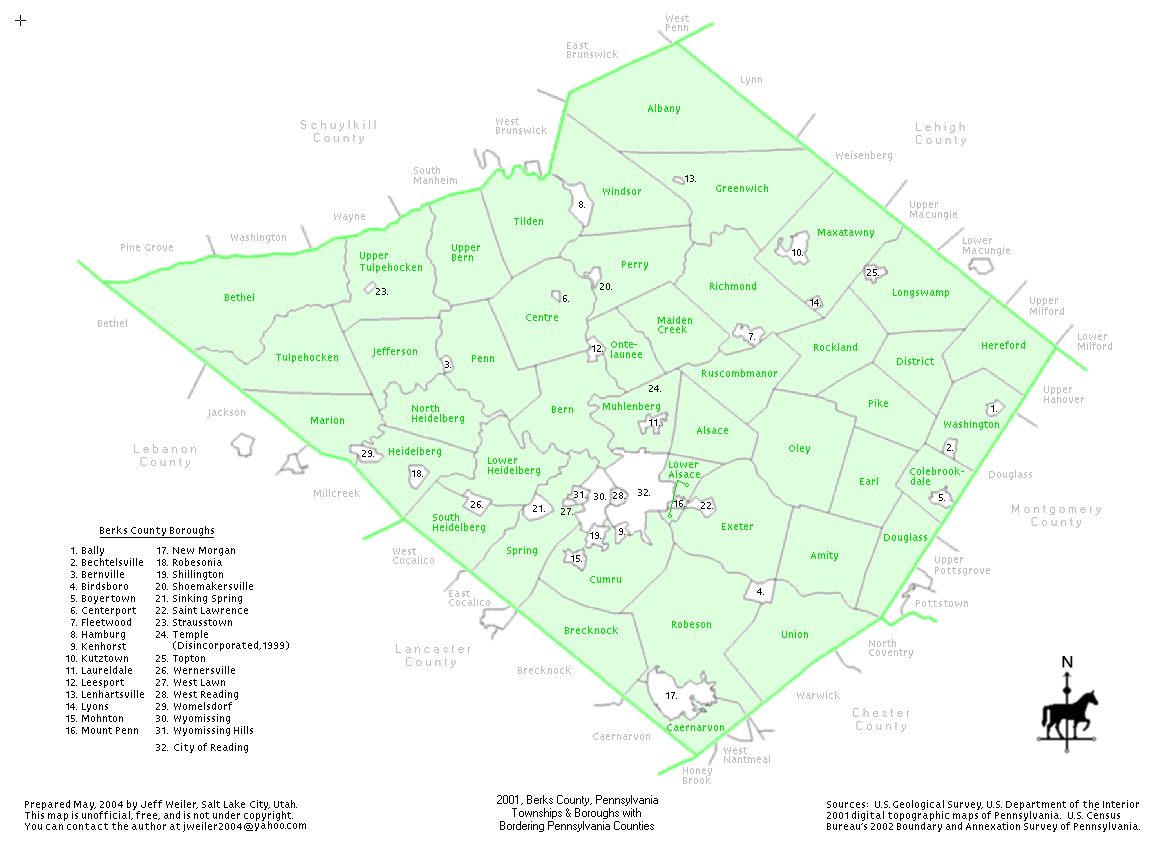 The following map showing townships in Berks County was created and contributed by Jeff Weiler. It is free for your use. Thanks Jeff!