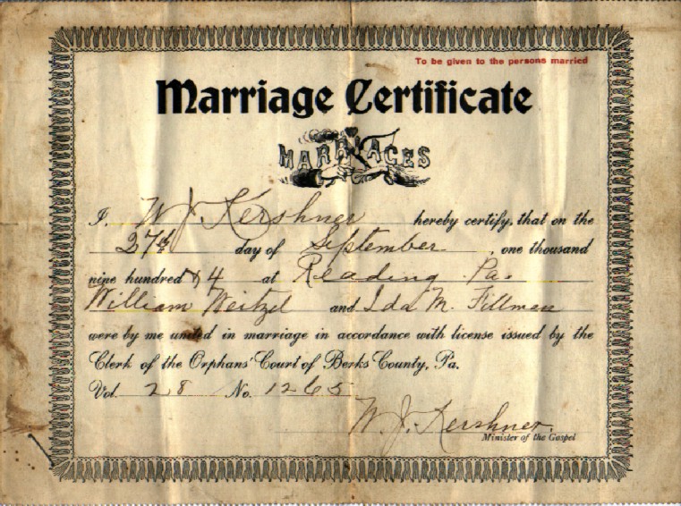 William was the son of Franklin and Mary Ann Engelhart Weitzel. William was born Jan 20, 1869 and died Jul 20, 1955. Ida was the daughter of Andrew and Anna Martha Greaves Fillman. She was born Mar 28, 1888 and died Sep 9, 1959 in Honeybrook, PA.
