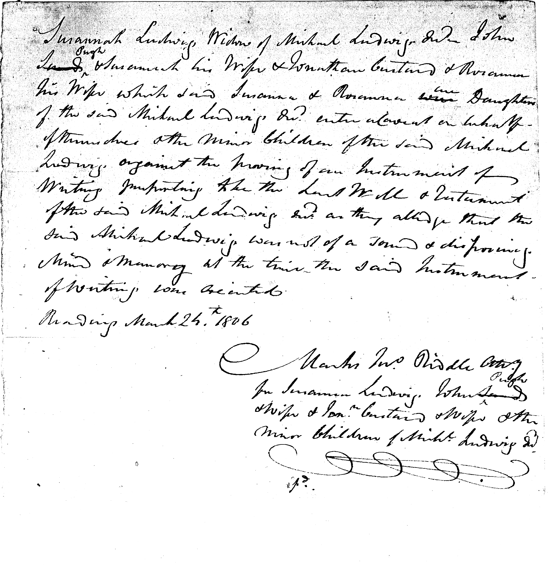 To 7 grandchildren, to wit: Catharine wife of Christian MICHAEL, John, William, Michael, Magdalena, Ludwick, and Mary RITH, and the children of son Michael deceased £10 to be divided.